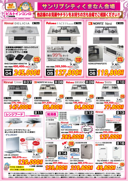 パロマ、リンナイ、ノーリツ コンロ各5台、数量限定で半額イカ!